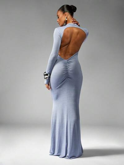 MISSGUIDED Sukienka maxi z odkrytymi plecami i wysokim dekoltem, z długim rękawem i dopasowaną talią