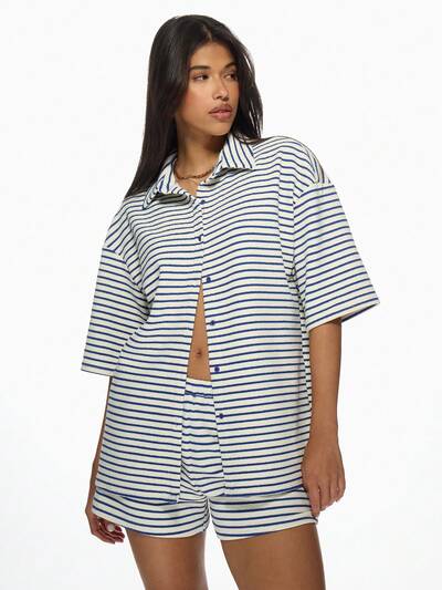 MISSGUIDED Bluzka z krótkim rękawem w paski z frotte, zapinana na guziki