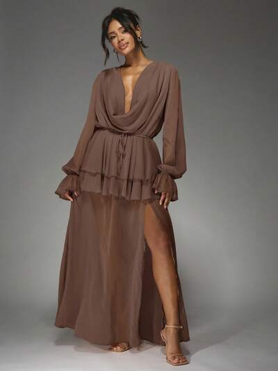 KIZN Sukienka maxi z głębokim dekoltem w kolorze rdzy, z długim rękawem i marszczeniami, z rozcięciem z boku, dopasowana, wieczorowa, formalna impreza