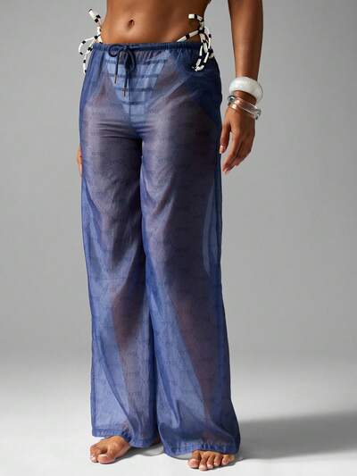 AiiRZ Spodnie plażowe z szerokimi nogawkami i aplikacją kwiatową, z siateczki z koronki, spodnie Palazzo, strój wypoczynkowy, narzutka na strój kąpielowy, miesiąc miodowy, impreza przy basenie, festiwal, moda