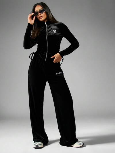 Missguided x Playboy Przytulne aksamitne szerokie spodnie dresowe z logo ze strasami28,43 USD47,39 USD