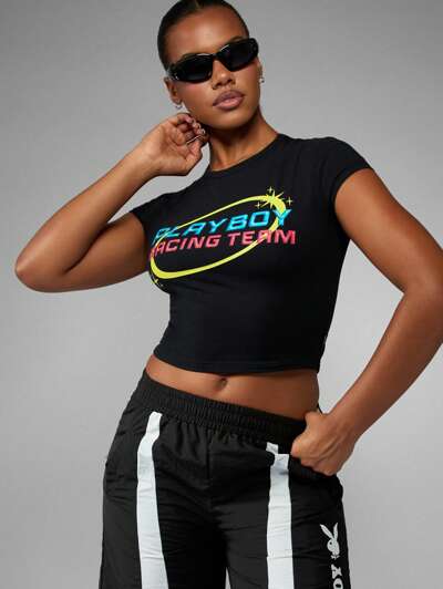 Missguided x Playboy Dopasowana krótka koszulka dla niemowląt z grafiką zespołu wyścigowego-40%