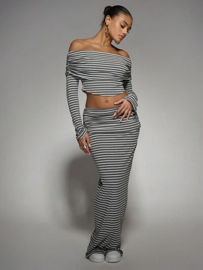AiiRZ Marszczony top i długa spódnica na okazję, wieczór, kurort, wakacje, strój na dzień, formalny, elegancki, dwuczęściowy, modny strój