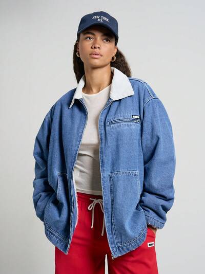 AiiRZ Oversized Workwear Sherpa Collar Denim Trucker Jacket Zima Jesień Casualowa odzież wierzchnia Street Style Utility Boyfriend Fit Jean Jacket z kieszeniami