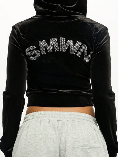 SUMWON WOMEN Luksusowa, swobodna bluza z kapturem i suwakiem z weluru z logo i kryształkami