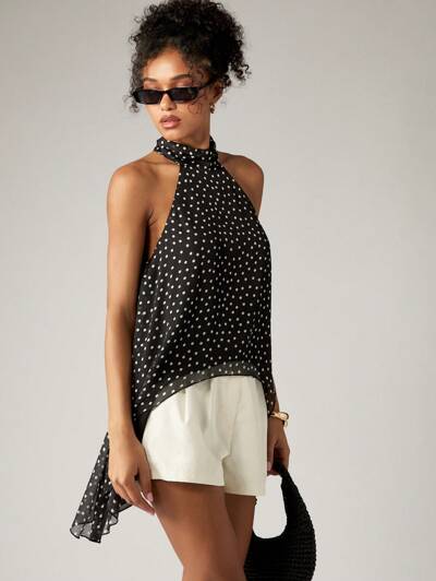 AiiRZ Top z szyfonu w groszki, z dekoltem halter, wysokim, niskim dołem, bez rękawów, na letnią imprezę, wieczór, festiwal, plażę, styl retro, uniwersalny i szykownyKod: SAVE25