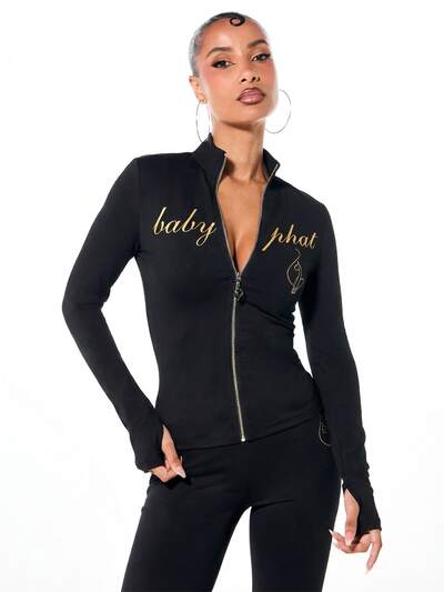 BABYPHAT Damski top z długim rękawem i wysokim kołnierzem, zapinany na suwak, z nadrukiem w kolorze złotym i brokatem, w modnym stylu ulicznym