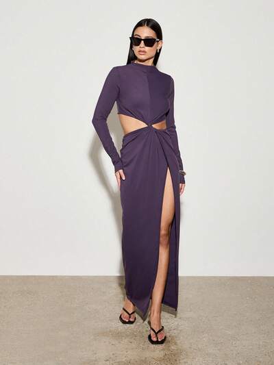 AiiRZ Sukienka maxi z wycięciem z przodu Twist, długi rękaw, wysoki dekolt, jesień, zima, wieczorowe przyjęcie, rozcięcie z boku, elegancka formalna suknia do ziemi