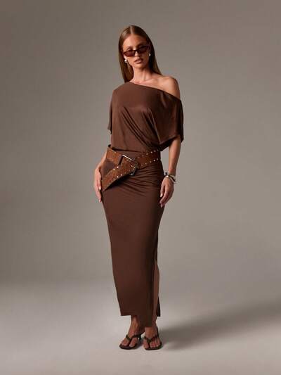 AiiRZ Elegancka sukienka maxi z odkrytymi ramionami, długa, brązowa suknia wieczorowa, asymetryczny dekolt, rozcięcie z boku, na specjalne okazje, wyrazisty pasek z ćwiekami, moda zimowa i jesienna