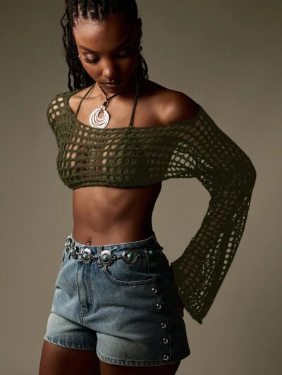 MISSGUIDED Krótki sweter z siateczki z rękawami dzwonkowymi-30%