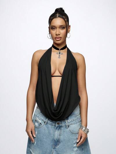 SUMWON WOMEN Elegancki, drapowany top z dekoltem halter, z przodu, na imprezę, do klubu, w nowoczesnym stylu wieczorowym i festiwalowymKod: SAVE25
