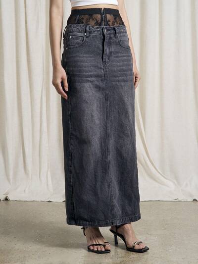 AiiRZ Spódnica z denimu o długości maxi z wysokim stanem i koronkowym gorsetem w pasie. Dżinsowa, gotycka, inspirowana stylem wiktoriańskim, jesienno-zimowa, w stylu grunge. Wyrazista moda.-40%