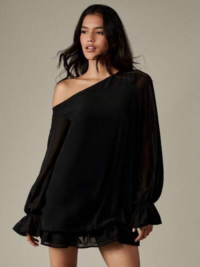 MISSGUIDED Sukienka mini na jedno ramię z bufiastymi rękawami i falbankami-45%