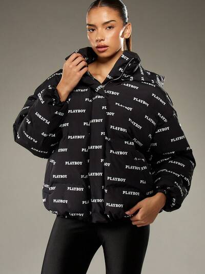 Missguided x Playboy Jaqueta acolchoada com capuz e estampa de logotipo