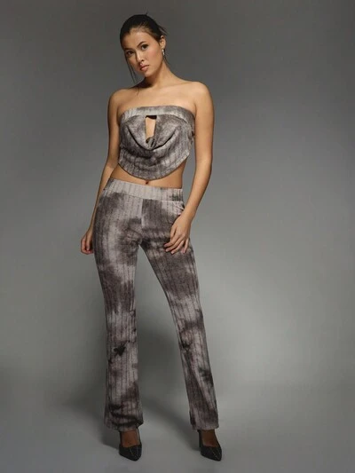MISSGUIDED Blusa bustiê listrada e desgastada com listras e calças flare, suéter coordenado
