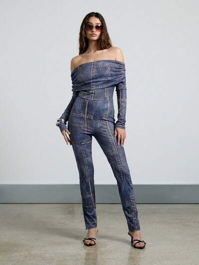 AiiRZ Macacão Justado de Manga Longa Bardot com Efeito Denim-40%