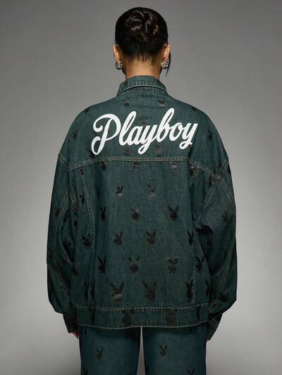Missguided x Playboy Jaqueta Denim oversized streetwear com estampa de coelho