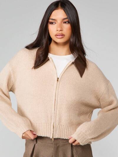 MISSGUIDED Cardigan curto com zíper e gola de couro