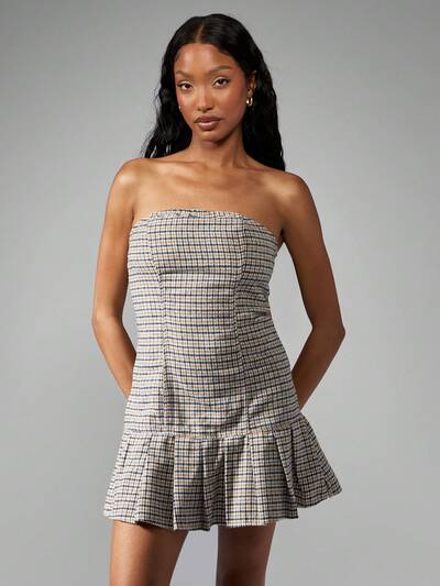 MISSGUIDED Vestido Míni Bandeau Tubinho com Bainha Pregueada e Cintura Caída em Tweed