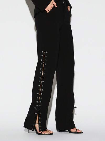 KIZN Calça Palazzo de Perna Larga com Detalhe de Cadarço e Fechamento Lateral com Ilhós, Cintura Alta, Comprimento Total, Calça Casual de Moda