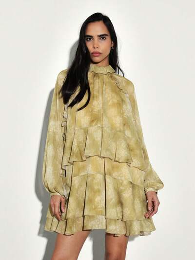 KSTM Vestido Curto Feminino de Manga Longa com Gola Alta, Babados em Camadas, Sobreposição de Chiffon Transparente e Detalhes Plissados em Camadas para Eventos de Coquetel