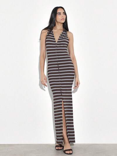 KSTM Vestido Longo Regata com Botões e Decote V Profundo com Fenda na Frente, em Estilo Listrado, para Ocasiões Casuais de Praia no Verão