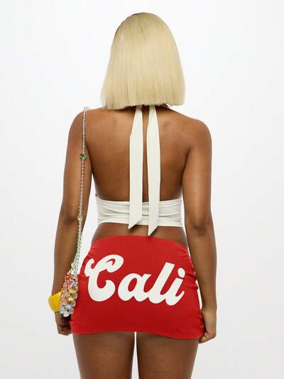 SUMWON WOMEN Saia Mini Franzida de Malha de Cintura Alta, Tecido Macio e Elástico, Ajustada, Casual, de Clube, Partido, Verão, com Impressão de Logo Tipográfico