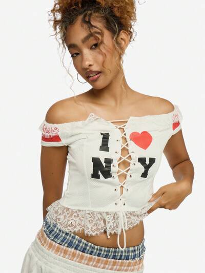 SUMWON WOMEN Top Ombro a Ombro com Cadarço Bardot Estilo Espartilho com Estampa de Coração e Detalhes em Renda para Moda de Verão e Festivais