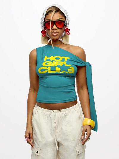 SUMWON WOMEN Top Cropped Assimétrica com Recorte Ombro Único, Gráfico de Letra Varsity, Detalhe de Amarração Lateral, para Estilo de Rua, Moda Urbana, Visual de Primavera e VerãoCódigo: SAVE25
