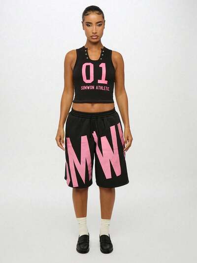 SUMWON WOMEN Regata Estilo Varsity Retrô Atlética, Cropped, Moda de Rua, Regata Esportiva Sem Mangas com Ilhoses e Detalhes Numéricos, Streetwear Casual Urbano para a Temporada de Festivais de Outono