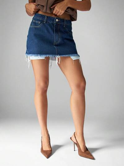 SUMWON WOMEN Saia Mini Denim Desgastada em Camadas, Barra Crua, Alta Cintura, Festival, Verão, Primavera, StreetwearCódigo: SAVE25