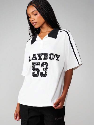 Missguided x Playboy Oversized Collared Tee With Athletic Print-40%