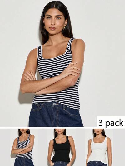 AiiRZ Essential Square Neck Tank Top 3-Pack Bundle Ribbed Knit Basic Cami Set Summer Layering Tops Collection Versatile Sleeveless Undershirt Pack-30%