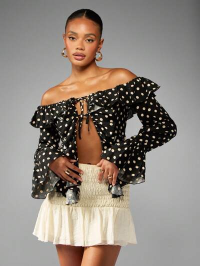 MISSGUIDED Off Shoulder Polka Dot Ruffle Blouse Bell Sleeves-35%