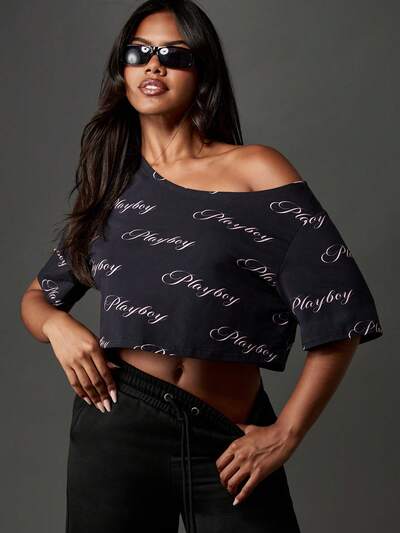 Missguided x Playboy Off Shoulder Script Print Crop Top With Short Sleeves-40%