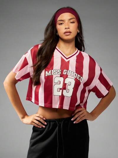 MISSGUIDED Striped Crop Jersey T-Shirt With Number Print-45%