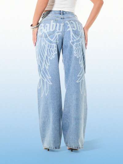 SUMWON WOMEN Denim Angel Wings Graphic Print Low Rise Wide Leg Slouchy Jeans With Back Pocket Text Design Casual Streetwear Statement-20%