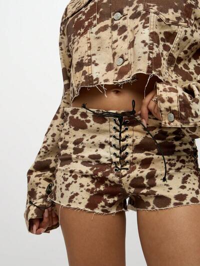SUMWON WOMEN Ultra High Rise Distressed Denim Booty Shorts With Lace Up Raw Hem Detail Animal Print Festival Party Summer Beach Hotpants-50%